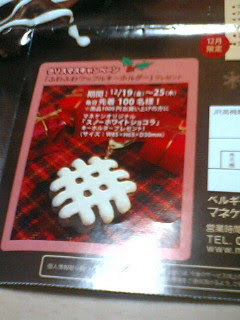 ところでちょっと話は逸れますが、今月の頭に例のワッフル店「manneken」でワッフルを購入したところクーポン券が付いて来まして、そのクーポン券に今月19~25日までの間1000円以上お買い上げのお客様毎日先着100名様に「ふわふわワッフルキーホルダー」というのがもらえるクリスマスキャンペーンをやるとの宣伝が載っていました。ほすぃ~!