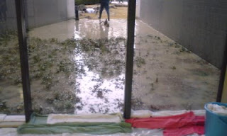 ごらんのように水浸しで、事務であろう人がシャベルを手に頑張って掘っていました。